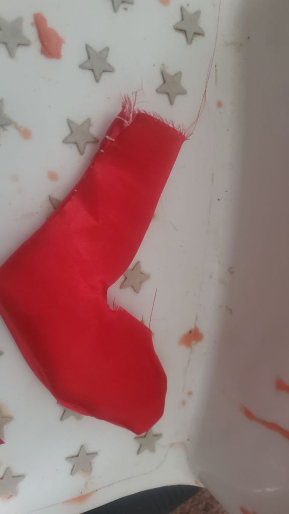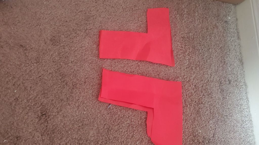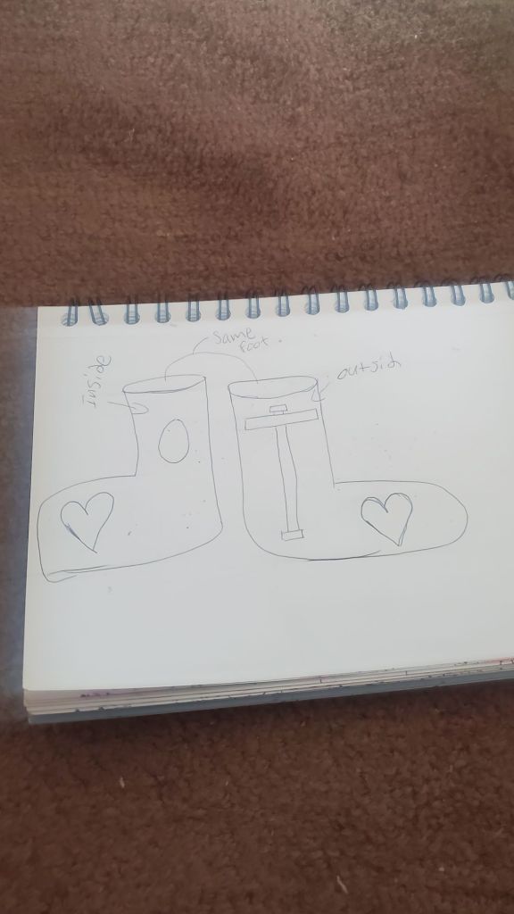 First thing I did when I started was to draw out my socks shape on a construction paper. After I was done drawing I then cut out the shape and placed it on my fabric to begin the process of cutting. See the pictures below. I didn’t feel like washing today so I didn’t draw it on the fabric this time like last time.