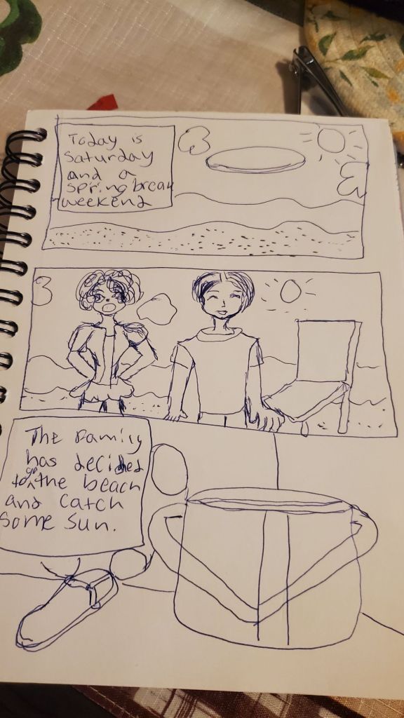 Well “The Eastsons” story is almost coming to an end, and as I reflect on this creative journey, I can’t help but feel a mix of nostalgia and excitement for what lies ahead. So, what will I be working on once it is done? Well, here is a sneak peek of my next writing project, which I believe will capture the hearts of readers just as “The Eastsons” did. The summary of the story is “The Glass Fan Family Goes to the Beach,” a delightful adventure that follows Glass Fan family as they navigate their way through a sunny day filled with fun and unexpected surprises by the ocean. It will be a short manga comic book that encapsulates the spirit of spring, and family bonding. I will be drawing and writing it myself, pouring my creativity into every detail to bring the characters to life. First, I will draw it out in my sketchbook, allowing my ideas to flow freely on the pages, and then redo it again with my drawing tablet later on, refining each panel to perfection. Without much ado, here is the first draft of the story; it is a short mini manga comic that I hope will captivate all who read it. Enjoy.